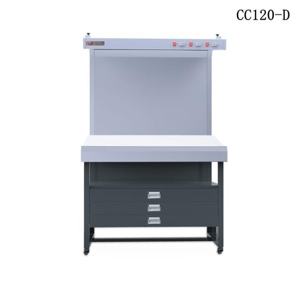 Model CC120-D color viewer light table features with upper and lower light and three drawers. It has 3 drawers more than CC120-C, and others are the same with CC120-C. It can choose one or two or three light sources from D65, D50, TL84 in the upper part, which will have 4 pcs installation there. And it also can choose only one light source from D65, D50 or TL84 in the lower part, which is with 6 pcs installation there. Different light source will have different price.